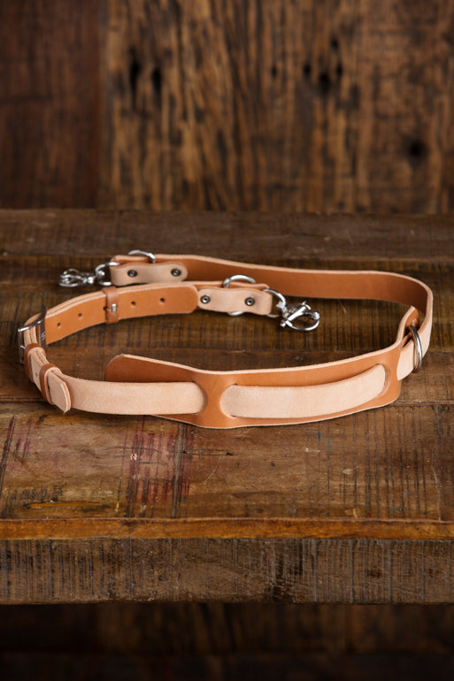 The Leather Lens Quiver can be worn just like a normal over the shoulder satchel with the included adjustable shoulder strap. This strap has a specific spot for hanging your glasses and keys on 3 separate d rings. It also comes with detachable sliders to connect this bag to the back of your MoneyMaker.